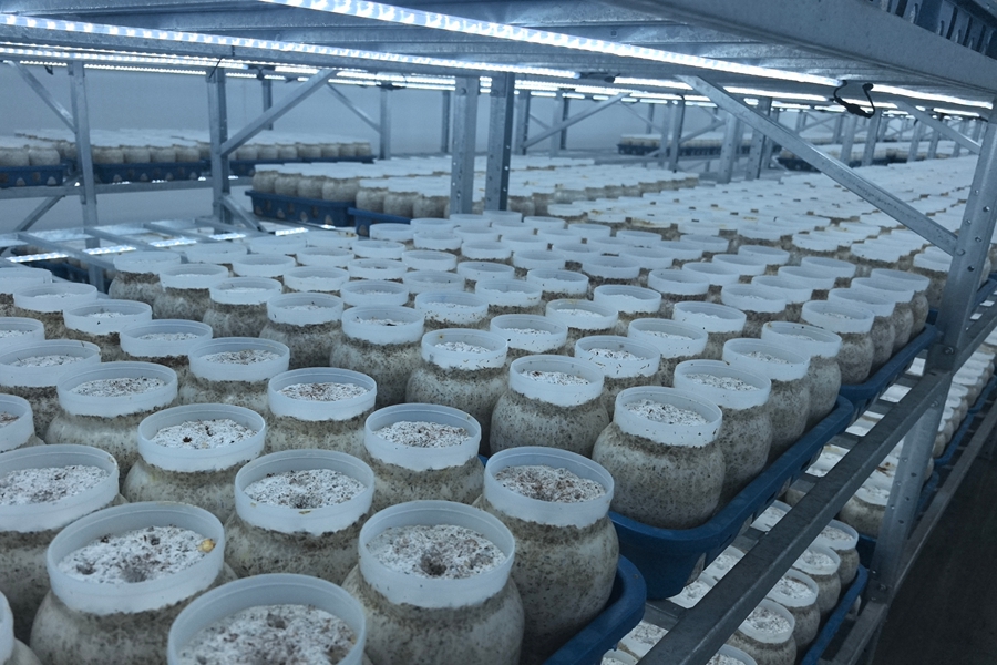 图为智能化培育车间里摆放整齐的菌瓶。