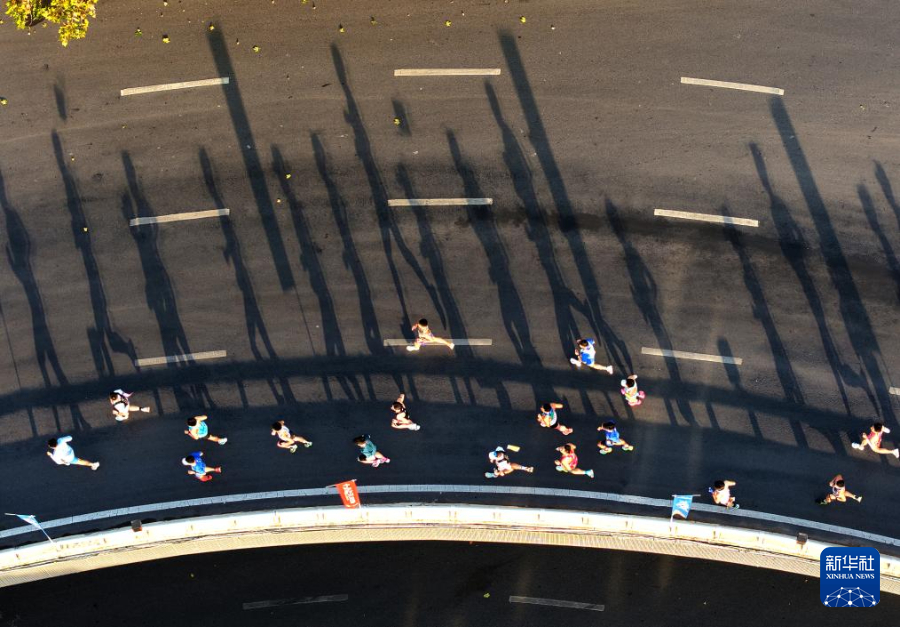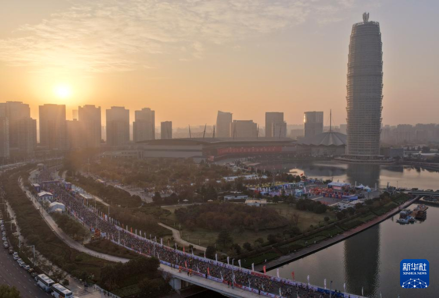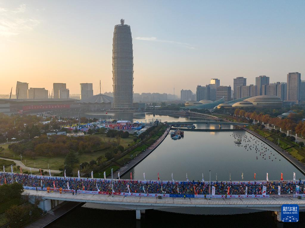 11月16日,参赛选手奔跑在郑州市如意湖畔(无人机照片)。新华社发(麻翛然 摄)