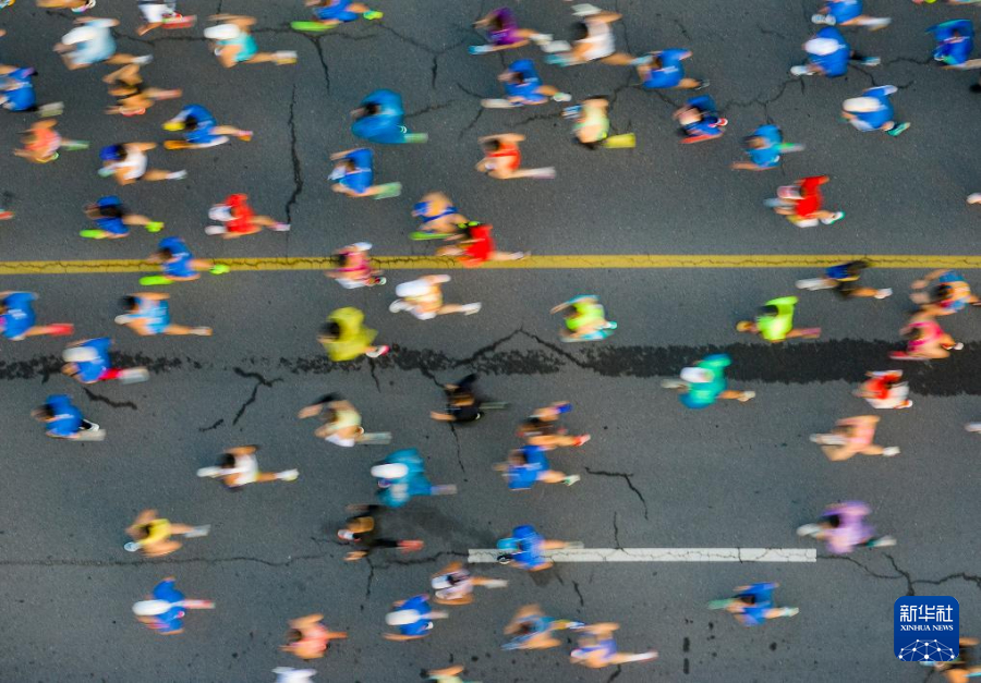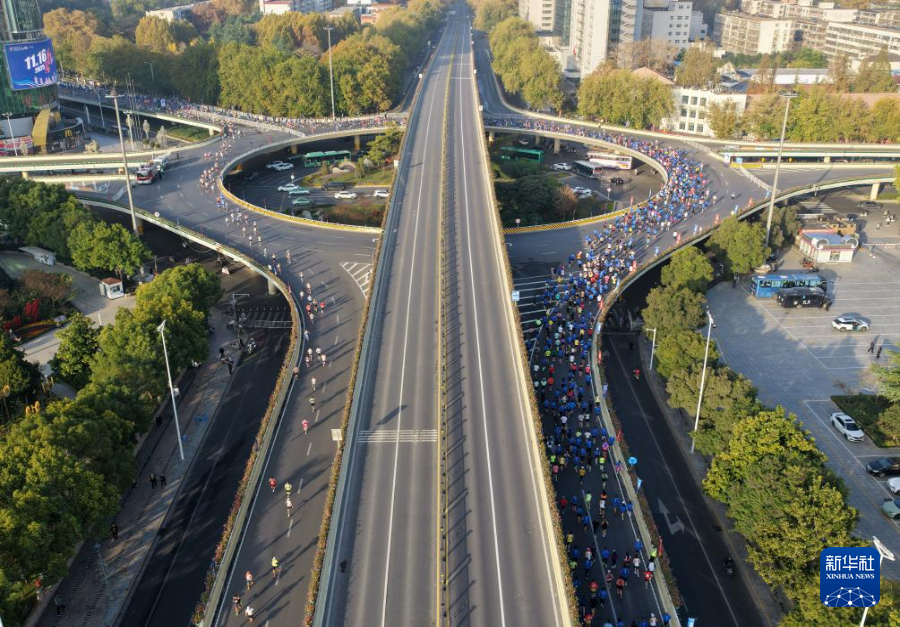 11月16日,参赛选手奔跑在郑州市紫荆山立交桥上(无人机照片)。新华社记者 李嘉南 摄