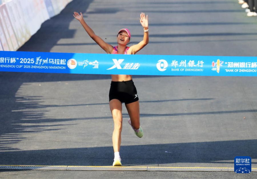11月16日,窦发仙在比赛中冲线。最终她获得女子全程马拉松赛冠军。新华社发(牛书培 摄)