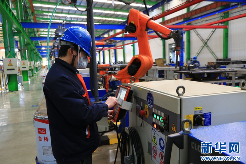 11月25日,在三门峡市陕州区,河南骏通车辆有限公司专用车生产线上的工人正在操作智能焊接机器人。王建栋 摄