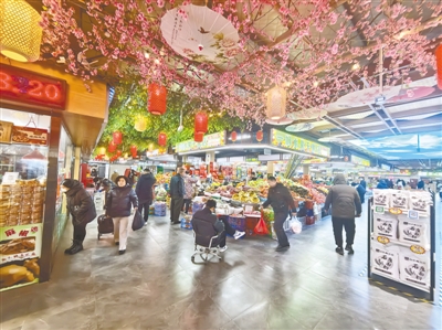 雕梁画栋、电梯绿植相映成趣,清明上河图和二十四节气等传统文化符号巧妙点缀…… 走进银河农贸市场,满满的文艺气息扑面而来。该市场周边有普罗旺世、四月天等多个大型居民小区,人流密集,承包了附近居民的“菜篮子”。