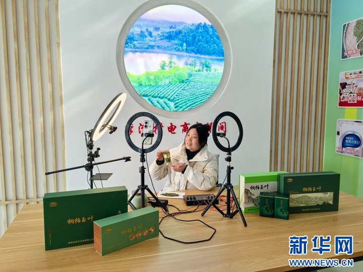 1月23日,刘沙在村里电商直播间宣传推介李湾茶叶。(新华社记者吴刚 摄)