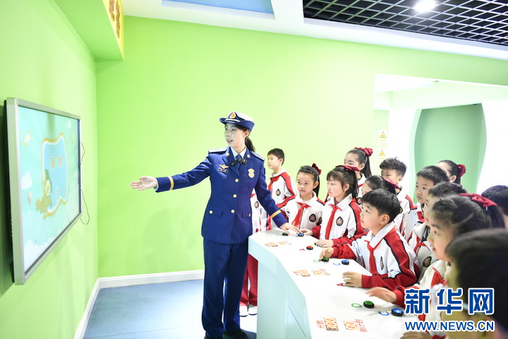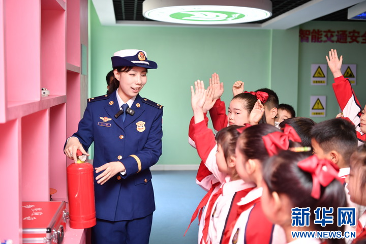 3月27日,在河南省南阳市第十五小学科普教育基地,消防员正在与学生互动。方建峰 摄